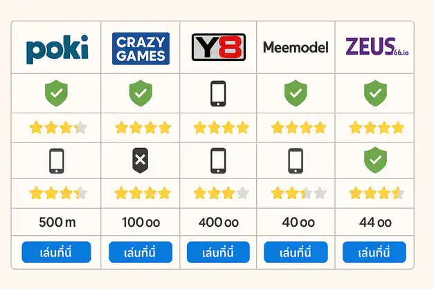 ในยุคปัจจุบัน การเล่นเกมออนไลน์ฟรีได้รับความนิยมอย่างล้นหลาม โดยมีหลายแพลตฟอร์มที่โดดเด่นในด้านต่าง ๆ ซึ่งแต่ละแห่งมีจุดเด่นและข้อจำกัดที่ผู้ใช้ควรคำนึงถึง ก่อนการตัดสินใจเลือกใช้บริการ เราจึงรวบรวมและเปรียบเทียบแพลตฟอร์มยอดนิยม 5 แห่ง ได้แก่ Poki, CrazyGames, Y8, Meemodel และ Zeus66.io โดยใช้เกณฑ์สำคัญ เช่น: สำหรับวิธีเริ่มเล่นได้ทันทีแบบไม่ต้องดาวน์โหลด แนะนำอ่านคู่มือ “ค้นหาและเล่นเกมออนไลน์ง่ายๆ ฟรี ที่นี่ทันที!” (https://zeus66.io/easy-online-games/)