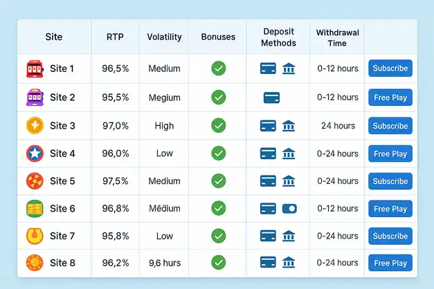 Table นี้ถูกออกแบบมาเพื่อเปรียบเทียบฟีเจอร์สำคัญๆ ของแต่ละเว็บไซต์ คุณจะพบกับ RTP หรืออัตราการจ่ายคืน, ความผันผวนของเกม, รวมถึงโบนัสต้อนรับที่แตกต่างกันออกไป อีกทั้งยังมีข้อมูลเกี่ยวกับช่องทางฝากถอนและระยะเวลาถอนเฉลี่ยที่คุณจะได้รับเมื่อทำการถอนเงิน สิ่งเหล่านี้ล้วนเป็นปัจจัยสำคัญในการเลือกเว็บสล็อตที่เหมาะสมกับคุณ